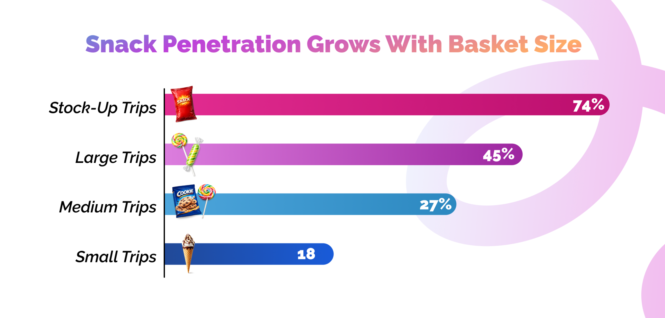 As trip size grows, the likelihood that shoppers include snacks rises sharply: